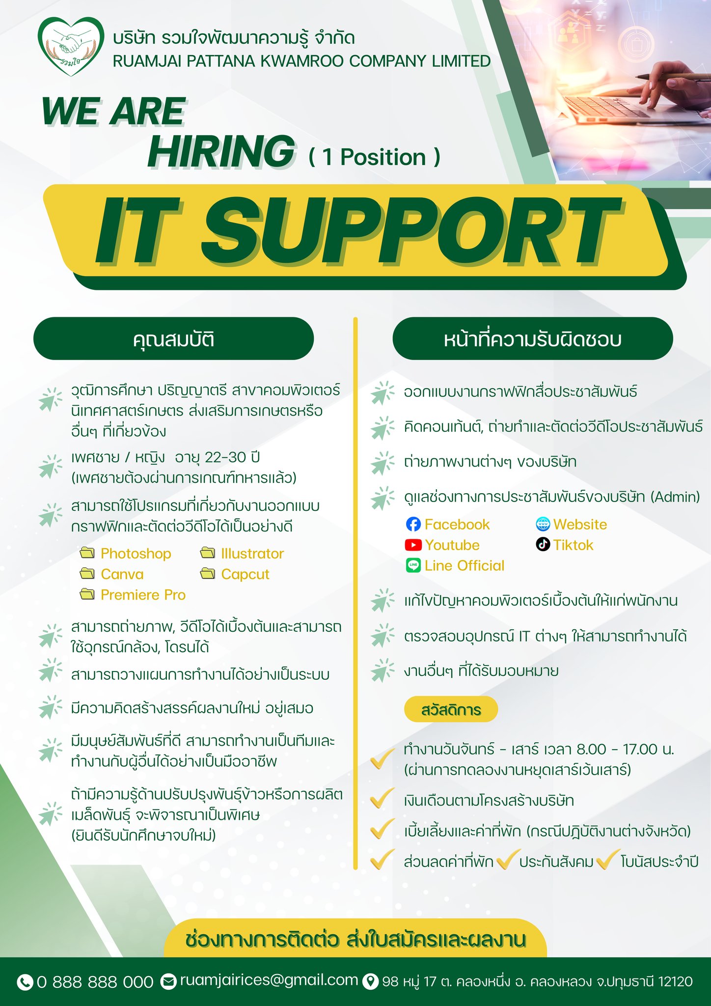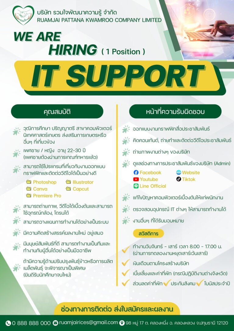 ตำแหน่ง: IT Support จำนวน 1 อัตรา