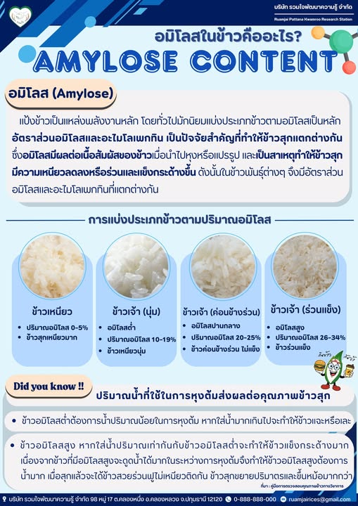 รู้หรือไม่??? ปริมาณ "อมิโลส" ในข้าวส่งผลโดยตรงต่อเนื้อสัมผัสข้าวสุก!!