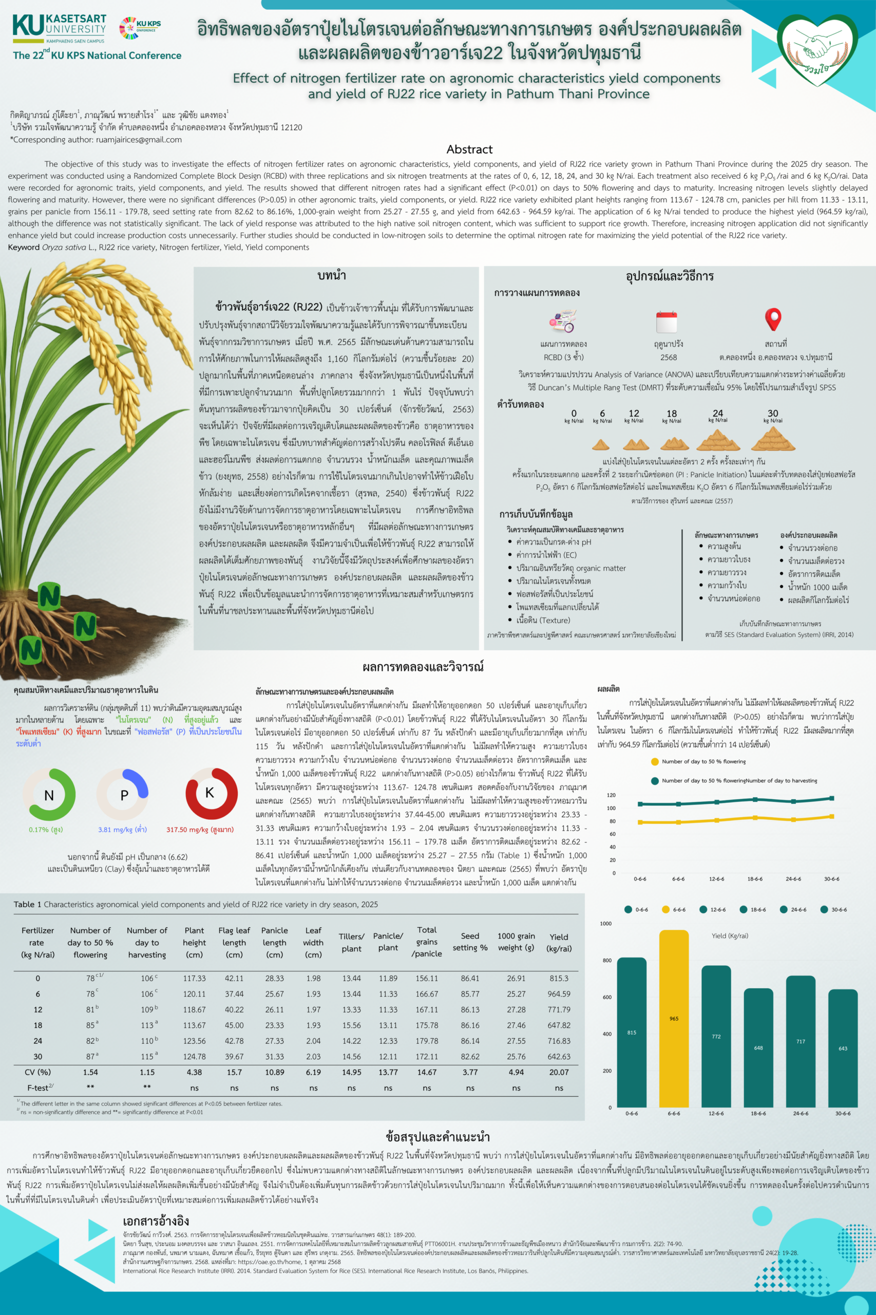(P2O5) อัตรา 6 กิโลกรัมฟอสฟอรัสต่อไร่ และโพแทสเซียม (K2O) อัตรา 6 กิโลกรัมโพแทสเซียมต่อไร่ ตามลำดับเก็บบันทึกข้อมูลลักษณะทางการเกษตร องค์ประกอบผลผลิต และผลผลิต จากการทดลองพบว่า การใส่ปุ๋ยไนโตรเจนในอัตราที่แตกต่างกัน มีผลต่ออายุออกดอก 50% และอายุเก็บเกี่ยวอย่างมีนัยสำคัญยิ่งทางสถิติ (P<0.01) โดยเมื่อเพิ่มระดับไนโตรเจนจะทำให้วันออกดอกและวันเก็บเกี่ยวล่าช้าเล็กน้อย แต่ไม่พบความแตกต่างอย่างมีนัยสำคัญต่อลักษณะทางการเกษตร องค์ประกอบผลผลิต และผลผลิต โดยข้าวพันธุ์ RJ22 มีความสูง 113.67-24.78 เซนติเมตร จำนวนรวงต่อกอ 11.33-13.11 รวง จำนวนเมล็ดต่อรวง 156.11-179.78เมล็ด อัตราการติดเมล็ด 82.62-86.16เปอร์เซ็นต์ น้ำหนัก 1,000 เมล็ด 25.27-27.55 กรัม และ มีผลผลิตข้าว 642.63-964.59 กิโลกรัมต่อไร่ อย่างไรก็ตาม ปุ๋ยไนโตรเจนในอัตรา 6 กิโลกรัมไนโตรเจนต่อไร่มีแนวโน้มในการผลผลิตสูงสุด (964.59 กิโลกรัมต่อไร่) แม้ว่าจะไม่แตกต่างกันทางสถิติ ทั้งนี้ เนื่องจากพื้นที่ปลูกมีปริมาณไนโตรเจนในดินอยู่ในระดับสูงเพียงพอต่อการเจริญเติบโตของข้าวพันธุ์ RJ22 การเพิ่มอัตราปุ๋ยไนโตรเจนไม่ส่งผลให้ผลผลิตเพิ่มขึ้นอย่างมีนัยสำคัญ และอาจเพิ่มต้นทุนการผลิตโดยไม่จำเป็น การศึกษาครั้งต่อไปควรดำเนินการในพื้นที่ที่มีปริมาณไนโตรเจนต่ำ เพื่อประเมินอัตราปุ๋ยที่เหมาะสมต่อการเพิ่มผลผลิตข้าวพันธุ์ RJ22อย่างแท้จริง
