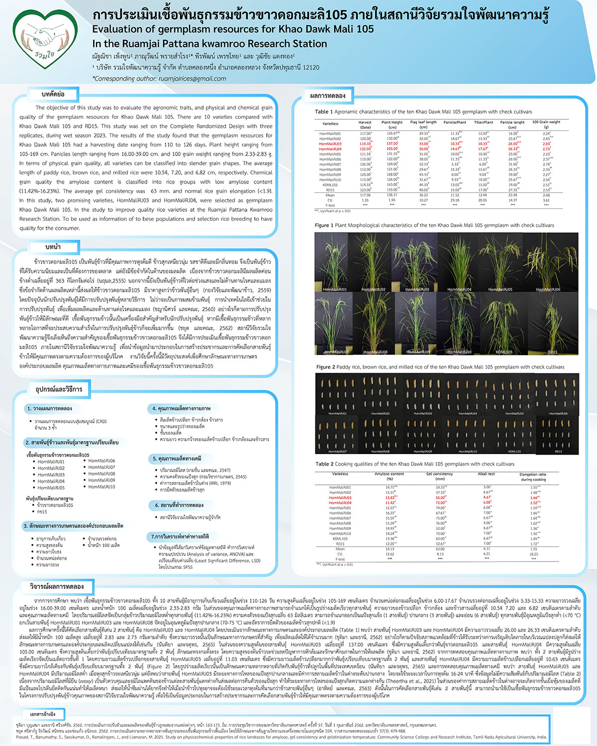 การศึกษาครั้งนี้มีวัตถุประสงค์เพื่อศึกษาลักษณะทางการเกษตร และคุณภาพเมล็ดทางกายภาพและเคมีของเชื้อพันธุกรรม ข้าวขาวดอกมะลิ 105 ภายในสถานีวิจัยรวมใจพัฒนาความรู้จำนวน 10 สายพันธุ์ เปรียบเทียบกับพันธุ์ขาวดอกมะลิ105 และ พันธุ์ กข15 โดยวางแผนการทดลองแบบสุ่มสมบูรณ์ (Completely randomized design: CRD) จำนวน 3 ซ้ำ ทำการทดสอบ ณ สถานีวิจัยรวมใจพัฒนาความรู้ จังหวัดปทุมธานี ในฤดูนาปีในปี พ.ศ. 2566 ผลการศึกษาพบว่า เชื้อพันธุกรรมข้าวขาวดอกมะลิ105 มีอายุการเก็บเกี่ยวเฉลี่ยอยู่ในช่วง 110-126 วัน ความสูงต้นเฉลี่ยอยู่ในช่วง 105-169 เซนติเมตร จำนวนหน่อต่อกอเฉลี่ยอยู่ในช่วง 6.00-17.67 จำนวนรวงต่อกอเฉลี่ยอยู่ในช่วง 5.33-15.33 ความยาวรวงเฉลี่ยอยู่ในช่วง 16.00-39.00 เซนติเมตร และน้ำหนัก 100 เมล็ดเฉลี่ยอยู่ในช่วง 2.33-2.83 กรัม ในส่วนของคุณภาพเมล็ดทางกายภาพสามารถจำแนกได้เป็นรูปร่างเมล็ดเรียวทุกสายพันธุ์ ความยาวของข้าวเปลือก ข้าวกล้อง และข้าวสารเฉลี่ยอยู่ที่ 10.54 7.20 และ 6.82 เซนติเมตร ตามลำดับ และคุณภาพเมล็ดทางเคมี จัดเป็นกลุ่มข้าว ปริมาณอมิโลสต่ำทุกสายพันธุ์ (11.42%-16.23%) ความคงตัวของแป้งสุกเฉลี่ย 63 มิลลิเมตร เป็นแป้งสุกแข็ง (1 สายพันธุ์) ปานกลาง (3 สายพันธุ์) และอ่อน (6 สายพันธุ์) ทุกสายพันธุ์มีอุณหภูมิแป้งสุกต่ำ (<70 °C) ยกเว้นสายพันธุ์ HomMaliRJ01 HomMaliRJ03 และ HomMaliRJ08 จัดอยู่ในอุณหภูมิแป้งสุกปานกลาง (70-75 °C) อัตราการยืดตัวของเมล็ดข้าวสุกปกติ (<1.9) ดังนั้นในการศึกษาครั้งนี้ได้ทำการคัดเลือกสายพันธุ์ดีเด่น 2 สายพันธุ์ คือ HomMaliRJ03 และ HomMaliRJ04 มาใช้เป็นเชื้อพันธุกรรม ข้าวขาวดอกมะลิ 105 ในโครงการปรับปรุงพันธุ์ข้าวคุณภาพของสถานีวิจัยรวมใจพัฒนาความรู้ เพื่อใช้เป็นข้อมูลประกอบ ในการสร้างประชากรและการคัดเลือกสายพันธุ์ข้าวให้มีคุณภาพตรงตามความต้องการของผู้บริโภค