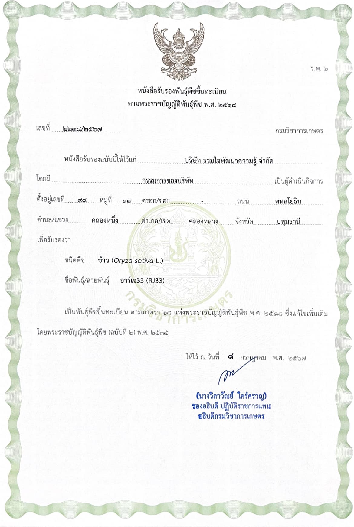 ข้าวพันธุ์ อาร์เจ33 (RJ33) (RJP189007-14-1-1-1-1-2-1-1) ข้าวเจ้าขาวพื้นแข็งไม่ไวต่อช่วงแสง อายุการเก็บเกี่ยวประมาณ 93 วัน ลักษณะทรงกอตั้ง เมล็ดเรียวยาว เริ่มการผสมพันธุ์ในปี พ.ศ. 2561 เกิดจากการผสมพันธุ์ระหว่างข้าวสายพันธุ์ RJPF172004 เป็นข้าวเจ้าไม่ไวต่อช่วงแสง ปริมาณอมิโลสสูง เป็นสายพันธุ์แม่ และข้าวสายพันธุ์ RJPHC174040 เป็นข้าวเจ้าไม่ไวต่อช่วงแสง อายุสั้น ผลผลิตสูง เป็นสายพันธุ์พ่อ ซึ่งทั้งสองสายพันธุ์เป็นข้าวเจ้าสายพันธุ์ปรับปรุงภายในสถานีวิจัยรวมใจพัฒนาความรู้ ดำเนินการผสมพันธุ์จนได้ลูกผสมชั่วที่ 1 (F1) ปล่อยให้มีการผสมตัวเองได้ลูกชั่วที่ 2 (F2) นำมาปลูกคัดเลือกโดยวิธีแบบสืบประวัติ (Pedigree Method) คัดเลือกต้นข้าวที่ออกดอกเร็ว ลักษณะทรงต้นดี การติดเมล็ดดี รูปร่างเมล็ดเรียวยาว ปล่อยให้ผสมตัวเองได้ประชากรชั่วที่ 3 (F3) ปลูกคัดเลือกสายพันธุ์จนได้ข้าวสายพันธุ์ปรับปรุงชั่วที่ 6 (F6) วิเคราะห์คุณภาพเมล็ดทางกายภาพและทางเคมีแล้วนำไปปลูกประเมินลักษณะทางการเกษตรและผลผลิต คัดเลือกสายพันธุ์ที่มีลักษณะ อายุสั้น ทรงกอตั้ง เมล็ดข้าวเปลือกเรียวยาว แล้วนำไปปลูกเปรียบเทียบศักยภาพการให้ผลผลิต 4 สถานที่ ได้แก่ สถานีวิจัยรวมใจพัฒนาความรู้ จังหวัดปทุมธานี แปลงเกษตรกร จังหวัดปทุมธานี แปลงเกษตรเกษตรกร จังหวัดสุพรรณบุรี และแปลงเกษตรกร จังหวัดชัยนาท 2 ฤดูกาล คือ ฤดูนาปรัง 2565 (มีนาคม ถึง มิถุนายน) และ ฤดูนาปี 2565 (สิงหาคม ถึง พฤศจิกายน) เพื่อประเมินลักษณะทางการเกษตรและองค์ประกอบผลผลิต คัดเลือกสายพันธุ์ที่มีการปรับตัวได้ดี ทรงต้นดี และให้ผลผลิตสูง จากนั้นนำไปปลูกเปรียบเทียบผลผลิตในแปลงเกษตรกร (Farmers Field Yield Trial) จังหวัดสุพรรณบุรี และจังหวัดชัยนาท ฤดูนาปรัง 2566 (มีนาคม ถึง มิถุนายน) และทดสอบเสถียรภาพการให้ผลผลิต จังหวัดสุพรรณบุรี และจังหวัดชัยนาท ฤดูนาปี 2566 (สิงหาคม ถึง พฤศจิกายน) พบว่า สายพันธุ์ RJP189007-14-1-1-1-1-2-1-1 เป็นสายพันธุ์ข้าวพื้นแข็ง ไม่ไวต่อช่วงแสง สามารถปรับตัวได้ดีในพื้นที่ปลูกทดสอบ ทั้ง 2 สถานที่ และให้ผลผลิตเฉลี่ยสูงถึง 1,320 กิโลกรัมต่อไร่ (ความชื้นร้อยละ 25) จึงได้ตั้งชื่อพันธุ์ว่า อาร์เจ33 (RJ33)